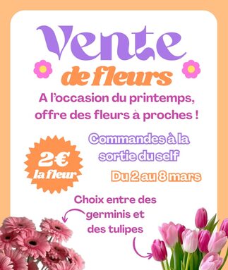 Par DANIELLE GERENTES, publié le vendredi 27 février 2026 16:08 - Mis à jour le vendredi 27 février 2026 16:12Le CVL organise une vente de fleurs durant la semaine du 2 au 6 mars. Pour vos commandes, RV à la sortie du self pendant la pause de midi ! -