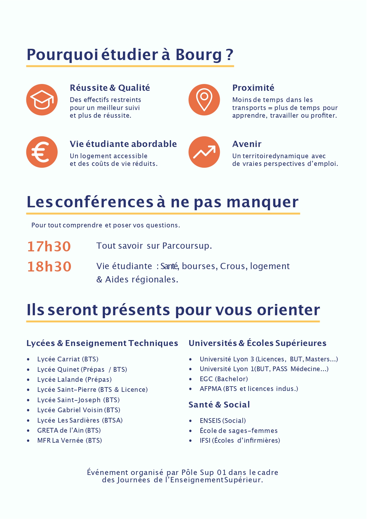 L'association pôlesup01 organise un forum de l'orientation post-bac, le jeudi 29 janvier, dès 16 heures, à la salle des fêtes de Bourg-en-Bresse dans le cadre des journées de l'enseignement supérieur.