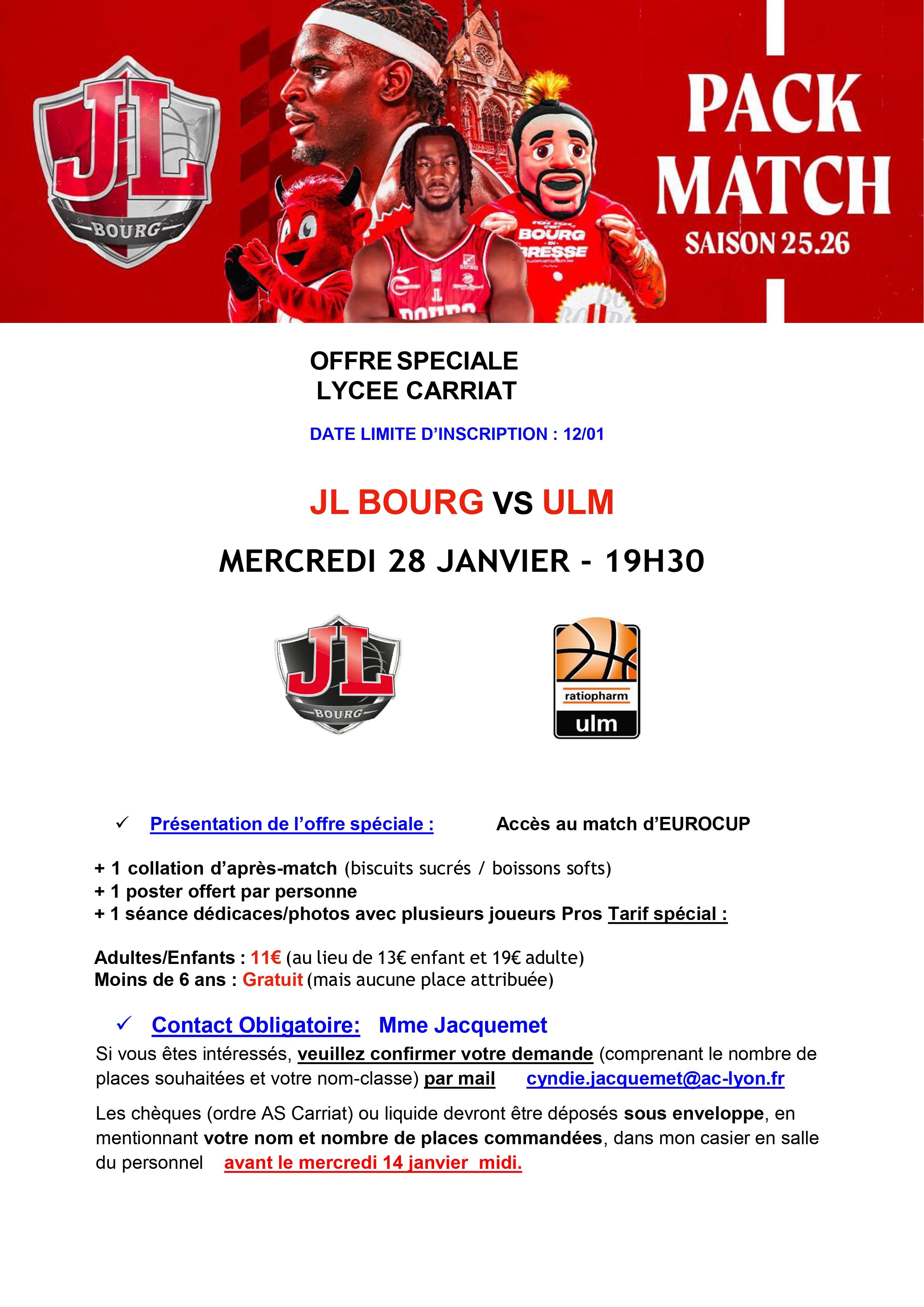 OFFRE: places pour le match de Basket JL BOURG contre ULM MERCREDI 28 JANVIER