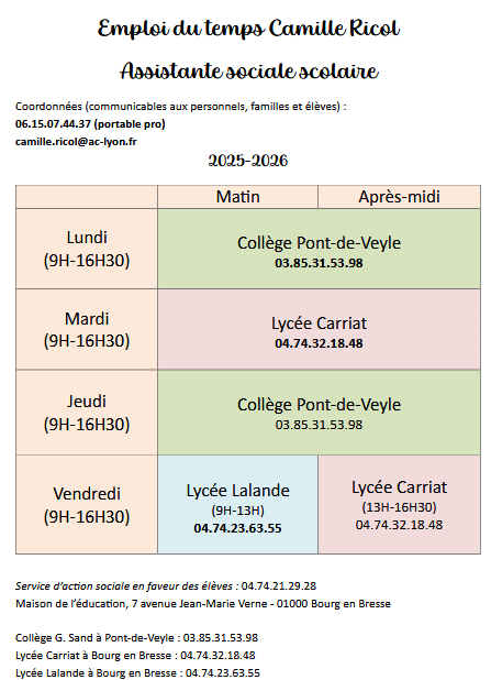ASSISTANTE SOCIALE Mme Camille RICOL Permanences le mardi de 9H à 16H30 le vendredi de 13H à 16H30 Vous pouvez venir sans rendez-vous, ou bien prendre RV via votre CPE, ou encore envoyer un message à camille.ricol@ac-lyon.fr |
