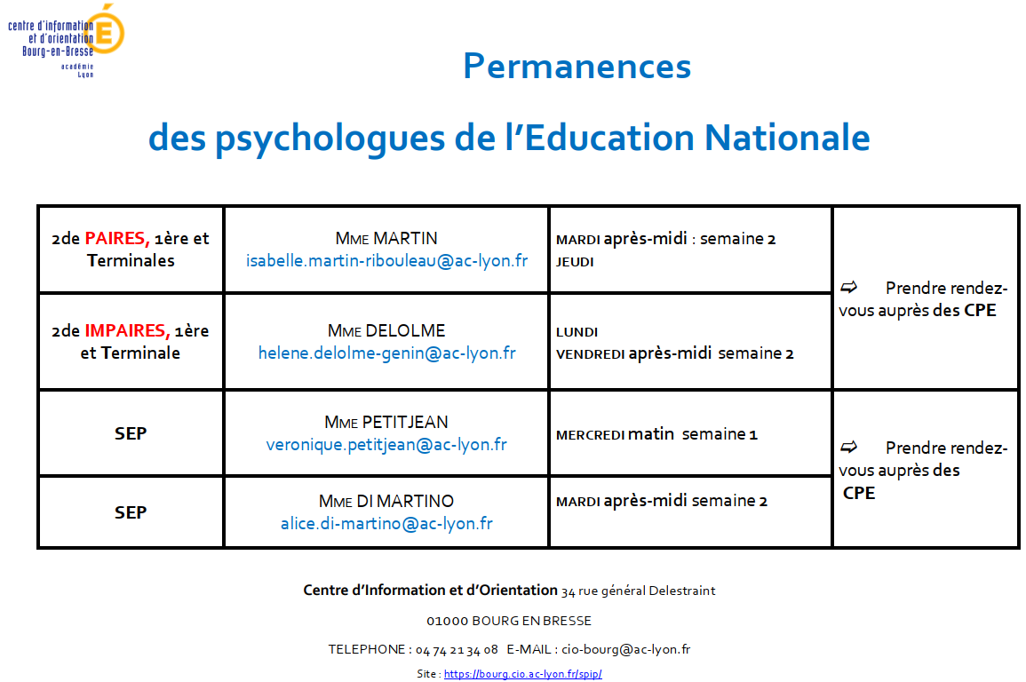PSYEN SEP: Mmes Véronique PETITJEAN et Alice DI MARTINO LGT: Mmes Hélène DELOLME et Isabelle MARTIN Prendre RV auprès de votre CPE. CONSULTER LA RUBRIQUE ORIENTATION ET LES PADDLET MIS EN LIGNE. |
